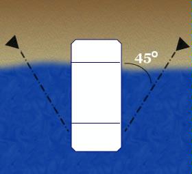 Start securing your houseboat by first throwing the ropes to the beach and then move your stakes or anchors from the front of the houseboat to positions approximately 45 degrees from the boat (see illustration). Use the provided hammer or shovel to either pound in your stakes, or dig anchor holes. Sturdy work gloves are a good idea - you may want to bring your own to be sure you have them handy. If it is windy, start from the prevailing side - the direction from which the wind is coming from. This will help keep the houseboat in position during tie down. If the wind pushed the houseboat out of position, during tie-down, the operator can steer the motors and apply a slight amount of throttle to straighten the boat.
